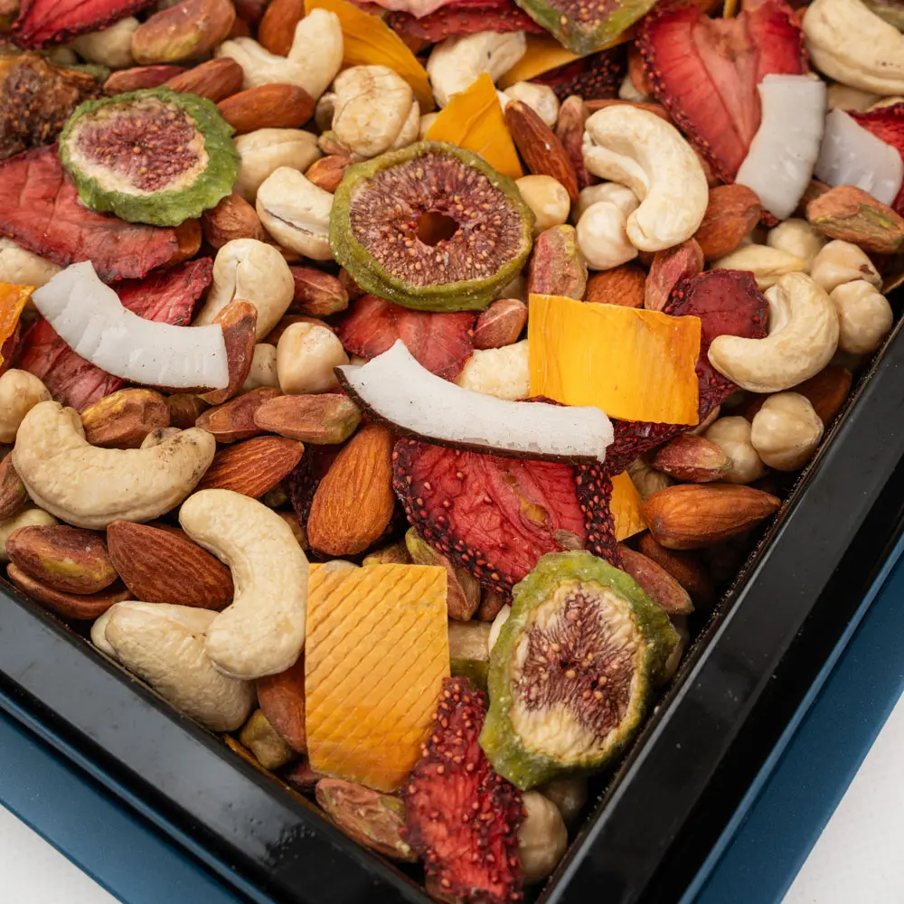 بادام هندی خام، بادام هندی شور، مغز پسته، مغز فندق، بادام درختی، اسلایس توت فرنگی، اسلایس انبه، اسلایس موز، اسلایس انجیر و اسلایس نارگیل.